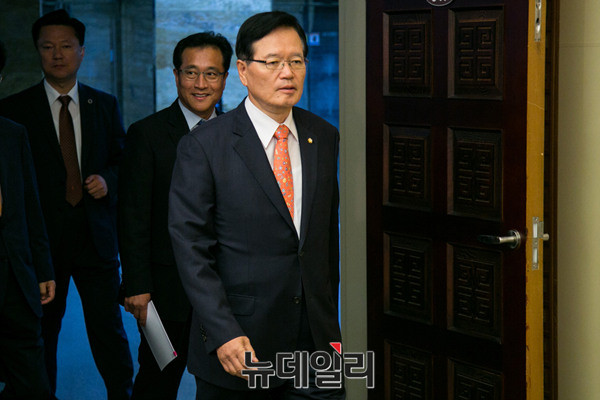 정의화 국회의장이 25일 오전 국회 국회의장 접견실에서 열린 퇴임기자회견을 위해 입장하고 있다.