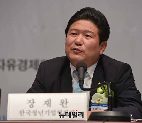 뉴데일리미디어그룹과 자유경제원이 26일 오후 한국프레스센터 국제회의장에서 '제20대 국회와 박근혜정부 후반기 과제'를 진단하는 '2016대한민국경제도약심포지엄'을 개최했다. 장재완 한국청년기업협회장이 토론에 참석해 발언하고 있다.