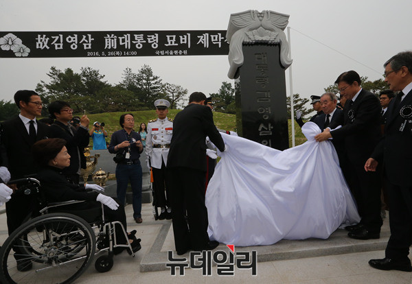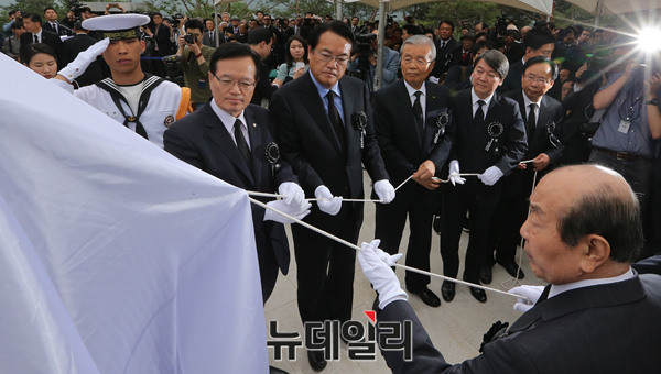 정의화 국회의장이 및 여야 지도부가 26일 오후 국립 현충원에서 열린 고 김영삼 전 대통령 묘비 제막식에 참석해 제막을 하고 있다.
