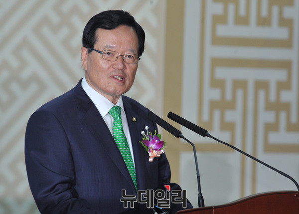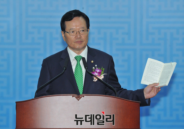 정의화 국회의장이 27일 오전 국회 로텐더홀에서 열린 '68주년 국회 개원 기념식'에 참석해 인사말을 하던 중 헌법을 들고 국회법 개정안에 거부권을 행사한 정부를 비판하고 있다.