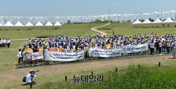 이들은 선언문을 통해 '대화를 통한 한반도 군사적 긴장완화', '정전협정을 평화협정으로 대체', '여성 리더십 확대' 등을 주장했다. (경기 파주=뉴데일리 정상윤)