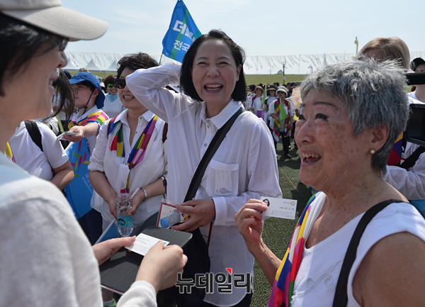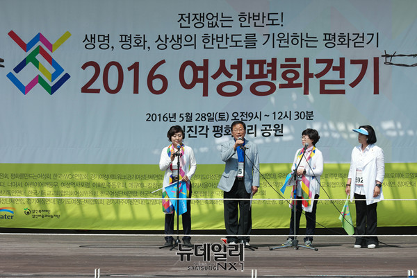 32개 여성단체로 구성된 '2016여성평화걷기조직위원회'가 28일 오전 경기 파주 임진각 일대에서 여성평화걷기를 개최했다. 이들은 임진각 철책로를 따라 약 6km를 걷고, 선언문낭독과 플래시몹을 진행했다.