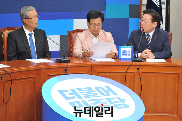 이재명 성남시장 등 경기지방자치단체장 들이 31일 오전 국회에서 더불어민주당 당대표실에서 지방재정 개편관련으로 김종인 비상대책위 대표를 면담하고 있다.