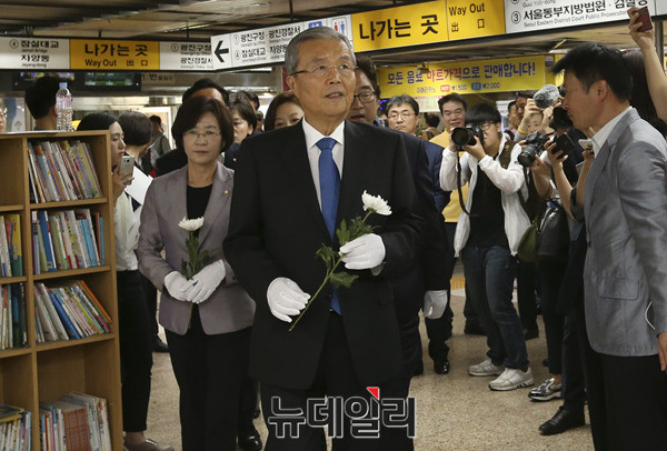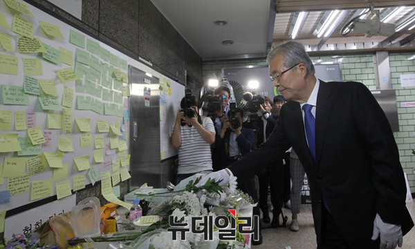 더불어민주당 김종인 대표가 31일 오후 서울 광진구 구의역을 찾아 지난 28일 스크린도어 정비 작업 중 사고로 숨진 김모씨의 추모공간에 헌화하고 있다.
