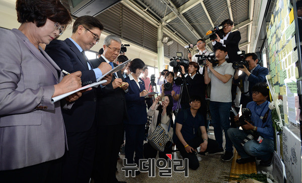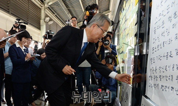 더불어민주당 김종인 대표와 을지로위원회 소속 의원들이 31일 오후 서울 광진구 구의역을 찾아 지난 28일 스크린도어 정비 작업 중 사고로 숨진 김모씨의 추모공간에 헌화하고 있다.