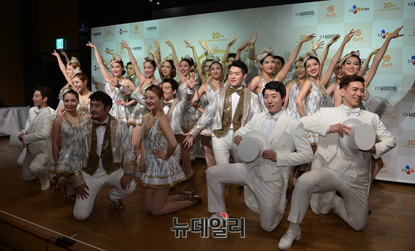 뮤지컬 '브로드웨이42번가' 제작발표회가 1일 오후 서울 마포구 CJ E&M에서 레지나 연출안무를 담당한 레지나 알그렌과 출연배우 송일국, 이종혁, 김선경, 최정원, 임혜영, 에녹이 참석한 가운데 진행됐다. 앙상블 멤버들이 포토타임을 갖고 있다.
