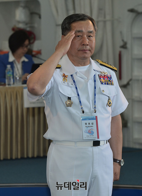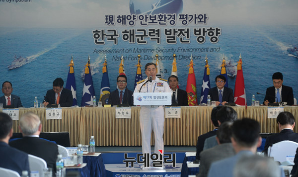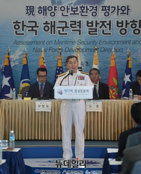 제17회 함상토론회가 3일 오후 제주민군복합항에 정박된 천왕봉함에서 '現해양안보환경평가와 한국해군력발전방향'을 주제로 개최됐다. 토론회에 참석한 정호섭 해군참모총장이 개회사를 하고 있다.