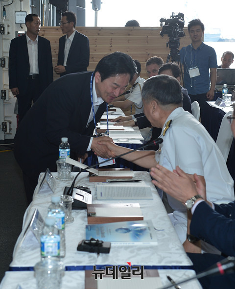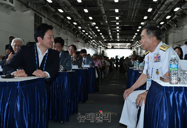 제17회 함상토론회가 3일 오후 제주민군복합항에 정박된 천왕봉함에서 '現해양안보환경평가와 한국해군력발전방향'을 주제로 개최됐다. 토론회에 참석한 정호섭 해군참모총장과 원희룡 제주도지사가 대화를 나누고 있다.