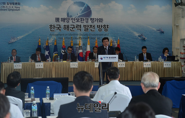 제17회 함상토론회가 3일 오후 제주민군복합항에 정박된 천왕봉함에서 '現해양안보환경평가와 한국해군력발전방향'을 주제로 개최됐다. 제주대학교 허향진 총장이 토론회에 참석해 축사를 하고 있다.