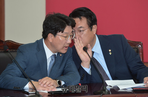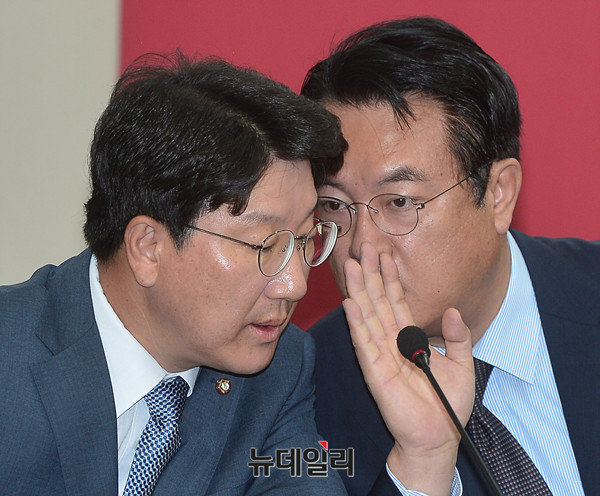 새누리당 혁신비상대책위원회 회의가 7일 오전 서울 여의도 새누리당사에서 진행된 가운데 정진석 원내대표와 권성동 사무총장이 귀엣말을 나누고 있다.