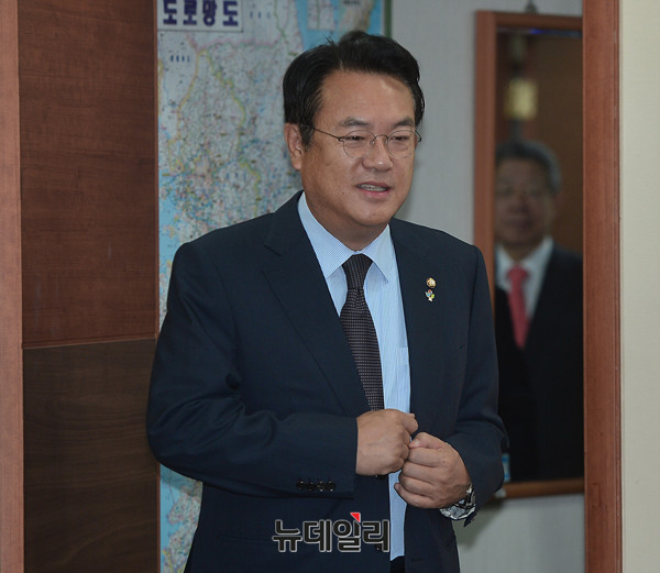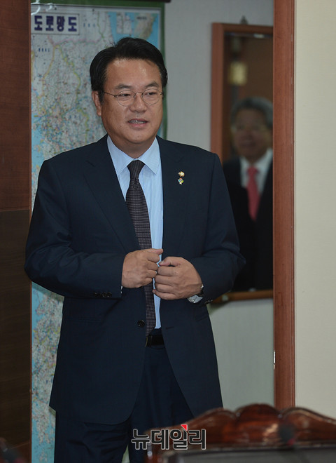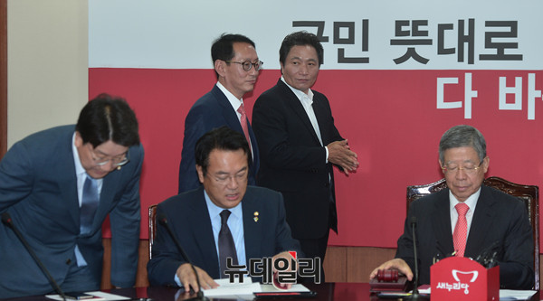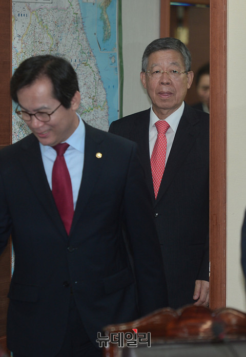 새누리당 김희옥 비상대책위원장, 정진석 원내대표를 비롯한 비대위원들이 오전 서울 여의도 새누리당사 회의실에서 진행된 혁신비상대책위원회 회의에 앞서 회의실에 입장하고 있다.