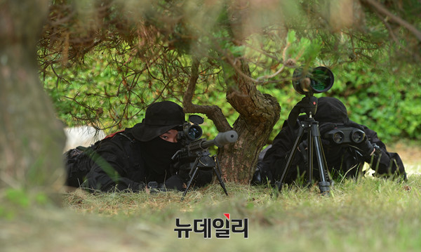 해군ㆍ해병대 신속기동부대가 서해안에서 전개하는 훈련이 8일 오전 경기 평택LNG기지에서 언론에 공개됐다. 신속기동부대 저격수가 건물 입구에 있는 테러범을 저격하기 위해 잠복해 있다.