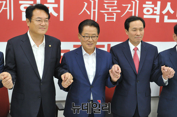 - ▲ 여야 3당 원내대표들이 8일 오후 서울 여의도 국회에서 20대 국회 원구성 협상에 합의 한 뒤 손을 맞잡고 있다. ⓒ이종현 기자