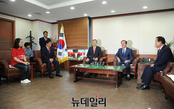 김희옥 새누리당 혁신비대위원장이 10일 오후 서울 여의도 당사를 방문한 이원종 대통령비서실장과 만나 면담하고 있다.