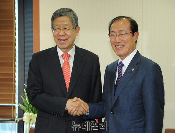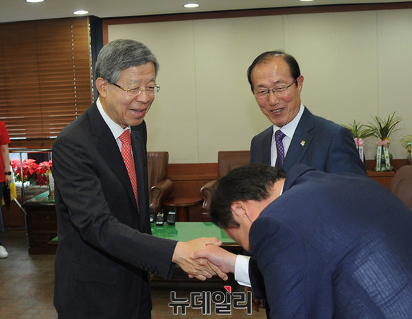이원종 대통령 비서실장과 김재원 청와대 정무수석이 10일 오후 서울 여의도 새누리당 당사에서 김희옥 비대위원장을 만나 악수를 하고 있다.