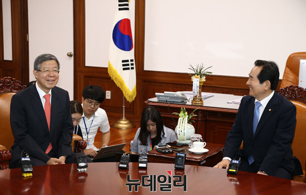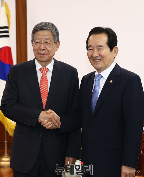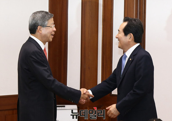 정세균 국회의장이 10일 오후 서울 여의도 국회에서 새누리당 김희옥 혁신비상대책위원장을 만나 악수하고 있다.