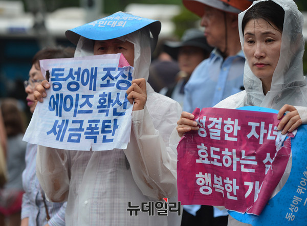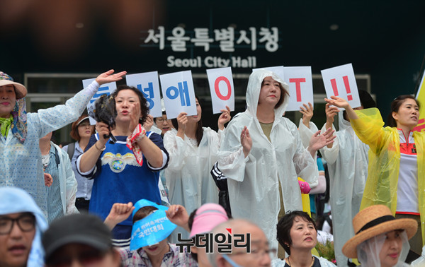 동성애 축제인 제17회 퀴어축제가 11일 오전 11시부터 서울광장에서 진행됐다. 퀴어퍼레이드는 이날 오후4시 30분 부터 서울광장을 출발해 서울도심을 순회했다. 퍼레이드 참가자들은 동성애 차별을 반대하는 피켓을 들고 행진했다.
