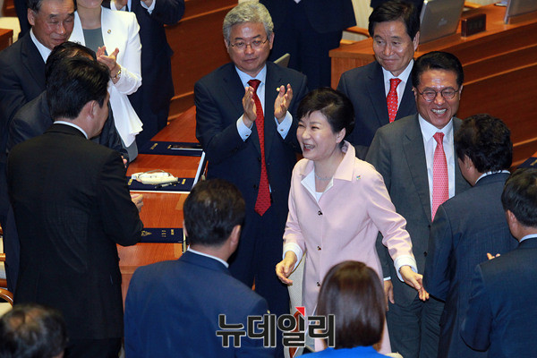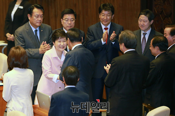 박근혜 대통령이 13일 오전 서울 여의도 국회 본회의장에서 열린 제20대 국회 개원식에서 시정연설 마치고 의원들과 인사를 나누고 있다.