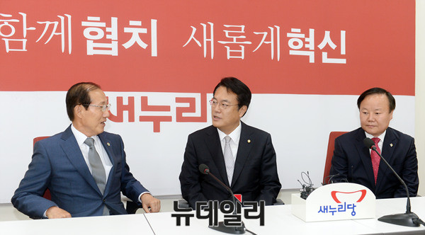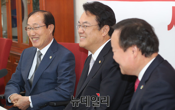 이원종 대통령 비서실장과 김재원 정무수석이 14일 오전 서울 여의도 국회 새누리당 원내대표실을 찾아 정진석 원내대표와 인사를 나누고 있다.