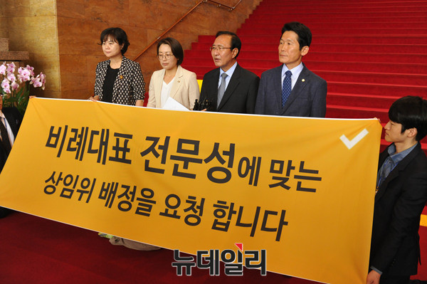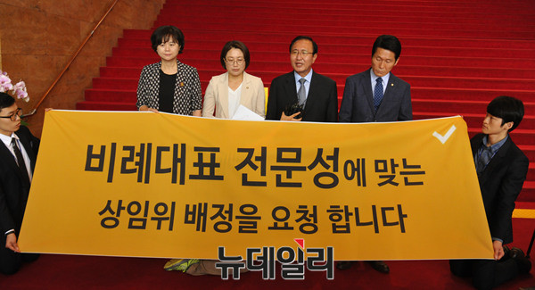 노회찬 정의당 원내대표와 소속의원들이 14일 오전 국회 로텐더홀에서 비례대표 상임위 재배정을 요구하는 기자회견을 갖고있다.