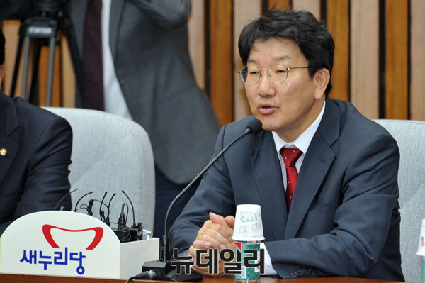 권성동 국회 법제사법위원장 14일 오전 국회에서 열린 새누리당 원내대책회의에서 모두발언 하고 있다.