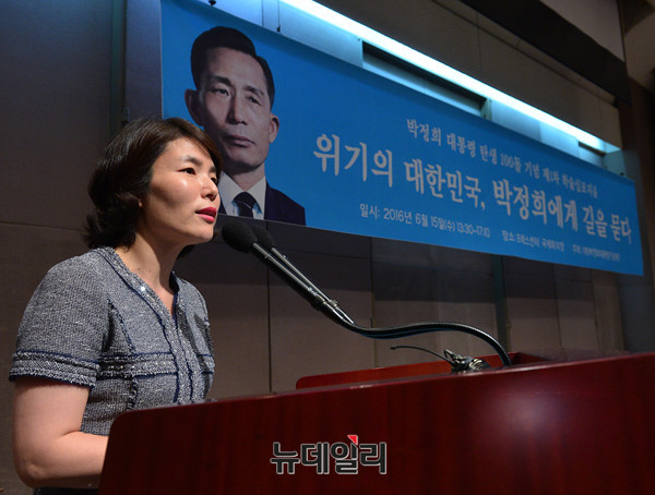 박정희대통령기념재단이 15일 오후 한국프레스센터 국제회의장에서 박정희대통령 탄생 100돌 기념 학술심포지엄 '위기의대한민국 박정희에게 길을묻다'를 개최했다. 새누리당 전희경 의원이 심포지엄에 참석해 인사말을 하고 있다.