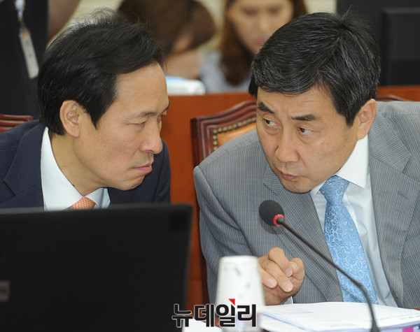 29일 오전 국회에서 열린 국방위원회 전체회의에서 우상호-이종걸 의원이 대화를 하고 있다.