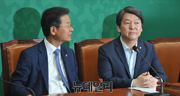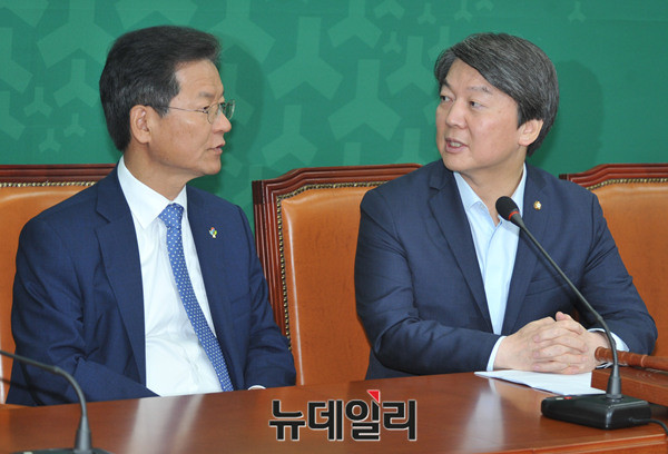 국민의당 안철수, 천정배 상임공동대표가 29일 오전 국회 당대표실에서 열린 최고위원회의에서 이야기를 나누고 있다.