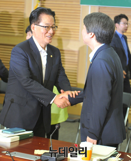 안철수 전 대표가 30일 오전 국회 의원회관에서 열린 정책역량강화 워크숍에 참석해 박지원 비상대책위원장과 악수를 나누고 있다.