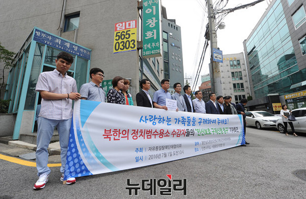 1일 자유통일 탈북단체 협의회는 서울 서초구 민변 사무소 앞에서 '북한 정치범 수용소 수감자 인신보호 구제청구' 관련 기자회견을 열었다.