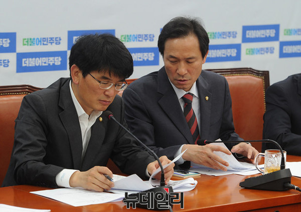 더불어민주당 우상호 원내대표와 박완주 원내수석부대표가 5일 오전 서울 여의도 국회에서 열린 원내대책회의에서 대화를 나누고 있다.