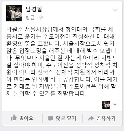 남경필 경기도지사가 청와대-국회 등을 세종시로 옮기는 '수도 이전 문제'에 꾸준히 목소리를 내고 있다.남 지사는 5일 박원순 서울시장이 이 같은 '수도 이전론'에 찬성 입장을 내자 "환영한다"며 긍정적 반응을 나타냈다.남경필 지사는 같은날 페이스북에 올린 글을 통해 "박원순 서울시장이 청와대와 국회를 세종시로 옮기는 수도 이전에 찬성하신데 환영의 뜻을 표한다"며 "서울시장으로서 쉽지 않은 입장 표명에 박수를 보낸다"고 했다.남 지사는 이어 "무엇보다 서울만 잘 사는게 아니라 지방도 잘 살아야 하며, 수도 이전을 정략적 정치적 차원이 아니라 전국적 전체적 차원에서 바라봐야 한다는 인식에 적극 공감한다"고 했다.