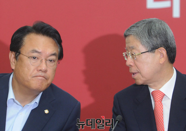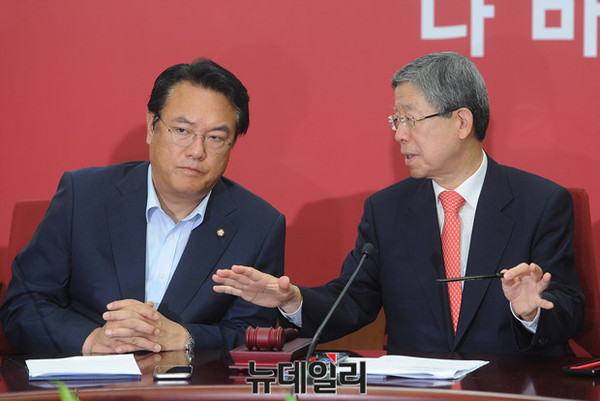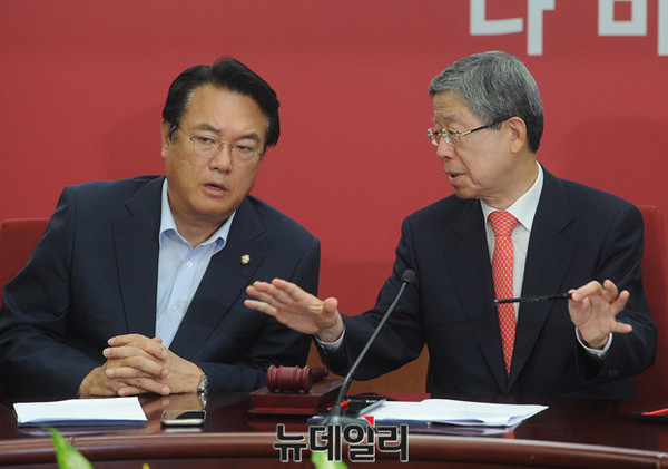 김희옥 새누리당 혁신비대위원장과 정진석 원내대표가 7일 오전 서울 여의도 당사에서 열린 혁신비상대책위 회의에서 대화를 나누고 있다.