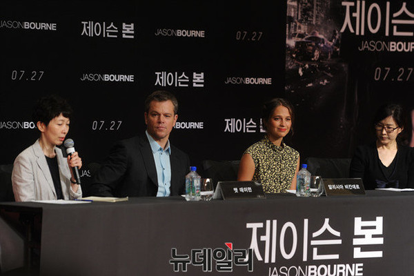 알리시아 비칸데르는 "다시 와서 행복하다. 내가 처음 한국에 왔을 때가 2010년 부산국제영화제였다. 그리고 내가 경험한 첫 국제 영화제가 바로 부산국제영화다. 그때는 감독이 출산 준비로 혼자 참석했었는데 따듯하게 환대해주셨던 기억이 있다. 어제 한국에 도착해 짧은 시간이지만 관광하고 맛있는 음식도 먹는 시간을 가졌다"고 전했다.맷데이먼은 '제이슨 본'으로 컴백한 소감에 대해 "다시 연기를 하게 돼 너무 좋다. '본'은 내 개인적인 인생과 커리어를 담은 캐릭터이기 때문이다. 물론 45살의 '본'과 29살의 '본'은 다를 수 있다. 뛰고, 도망 다니고, 추격하고, 빠르고 민첩하게 움직여야 해서 연기하는 데 힘든 부분이 있다. 하지만 이번 '제이슨 본'은 오리지널 제작진들도 같이 결합해 촬영했다"고 설명했다.이어 "이렇게 재회해서 작업하는 일은 드문데 이런 경험을 하게 돼 기쁘다. 감독님에게도 정말 감사하는 마음으로 즐겁게 재미있게 촬영하자는 이야기를 했다. 첫 '본' 시리즈는 힘들고 어려운 부분도 있었지만 이번에는 준비를 많이 해서 즐겁고 재미있는 촬영장이 되었다"고 덧붙였다.