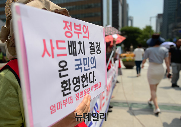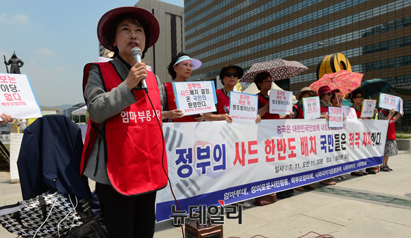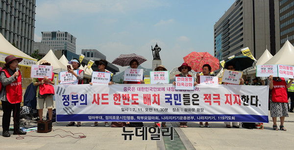 엄마부대봉사단이 11일 오전 광화문광장에서 기자회견을 열고 "정부의 사드 한반도 배치를 적극 지지한다"고 밝혔다.