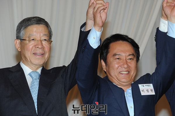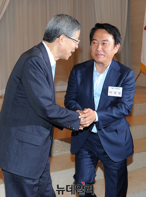 새누리당 김희옥 혁신비상대책위원장과 이성헌 원외위원장협의회장이 11일 오후 서울 여의도 중소기업중앙회에서 열린 2016 새누리당 전국원외위원장협의회 전체회의에서 악수하고 있다.