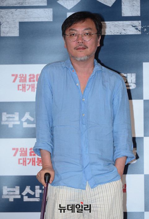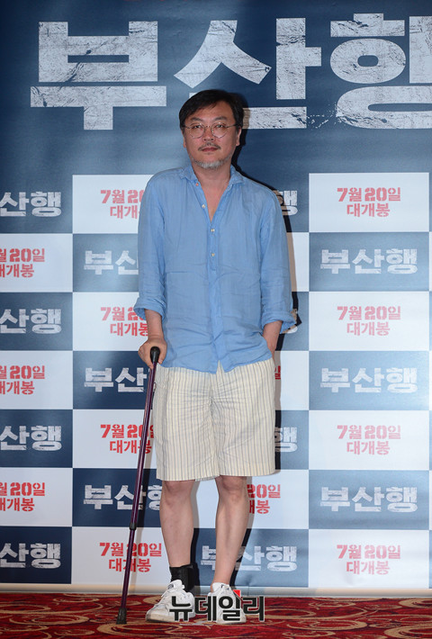 재난 블로버스터 영화 '부산행(Train to Busan, 감독 연상호)'에서 대기업 상무 용석 역을 맡은 배우 김의성이 12일 오후 서울 광진구 롯데시네마 건대입구에서 열린 언론시사회에 참석해 포토타임을 갖고 있다. 이날 김의성은 촬영 중 다친 다리로 지팡이를 짚고 등장했다.