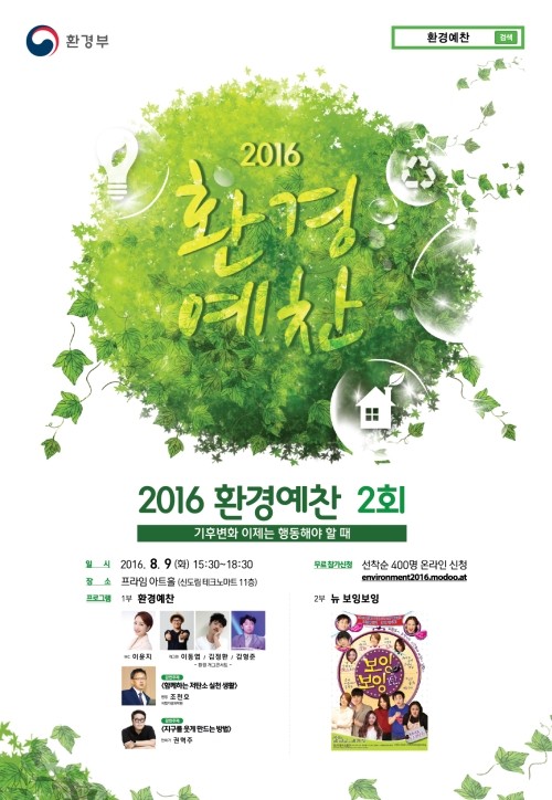 '2016 환경예찬 2회'가 내달 9일 열린다.환경부가 주최한 '2016 환경예찬'은 주민들과 직접 소통하는 환경 강연 프로그램으로 지난 7월 6일 대학로 아트원씨어트에서 1회를 진행해 큰 호응을 얻었다.8월 9일 오후 3시 30분 프라임 아트홀(신도림)에서 개최하는 이번 강연은 '기후변화 이제는 행동해야 할 때'라는 테마로 음식, 문화, 생활양식까지 많은 것을 바꿔 놓고 있는 기후 변화에 대해 조천호 원장(국립기상과학원), 에코 웹투니스트 권혁주가 강연자로 나선다.조천호 원장은 '함께하는 저탄소 실천 생활'을 주제로 작은 관심과 우리 생활 속에서의 실천을 통해 누구나 동참할 수 있는 저탄소 실천 생활의 필요성에 대해 설명한다.국내 에코 웹툰 분야의 독보적 일인자인 권혁주는 '지구를 웃게 만드는 방법'이라는 주제아래 미래세대에 삶의 터전이 될 지구를 보호하는 방법을 에코 웹툰을 통해 소개한다. 이번에도 1회 때부터 함께 해온 SBS 공채 개그맨 이동엽, 김정환, 김형준 사단이 환경 '개그콘서트'로 무대에 오른다.강연에 이어 2부에서는 바쁜 시간을 할애한 참가자들을 위해 연극 '뉴보잉보잉 1탄' 공연 관람의 기회를 제공한다. 2002년 초연된 '뉴보잉보잉'은 바람둥이 남자가 미모의 스튜어디스 세 명을 동시에 사귀면서 벌어지는 해프닝을 그린다.'환경예찬'은 환경보전에 대한 국민의 적극적이고 긍정적인 관심을 유도하기 위해 행사다. 7월부터 10월까지 총 4회에 걸쳐 개최될 예정이며, 강연 참여와 공연 관람은 모두 선착순 400명 무료로 누구나 신청 가능하다.[사진=NewsCSV]