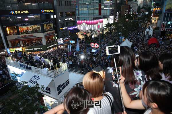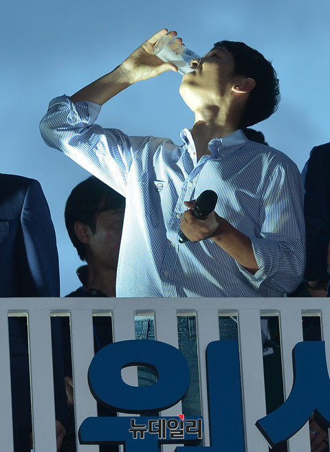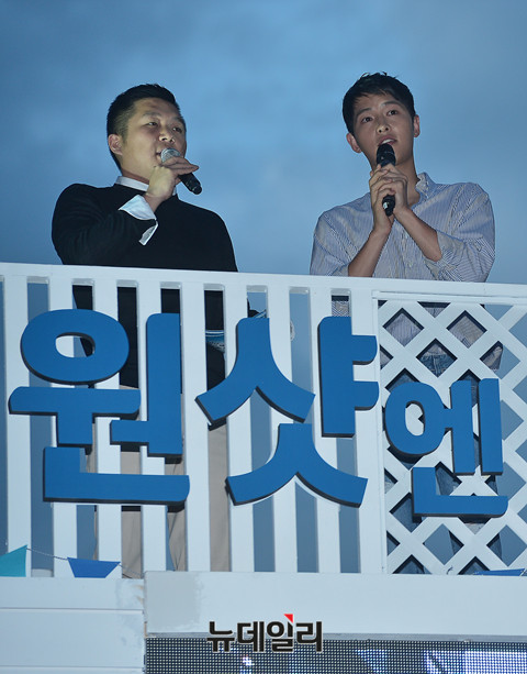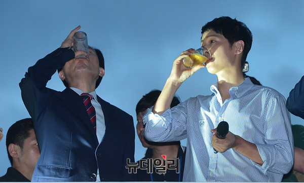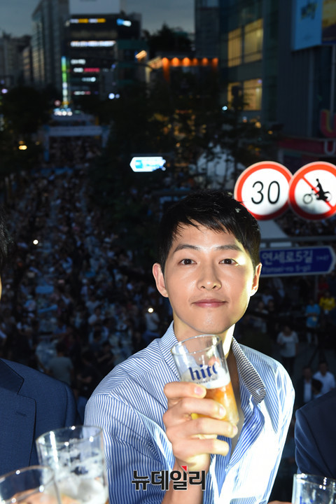 하이트진로 모델 송중기가 14일 오후 신촌 연세로 일대에서 열린 '하이트원샷웨이브페스티벌'에 참가해 맥주를 원샷하는 퍼포먼스를 선보였다. 연세로일대를 메운 팬들은 송중기의 원샷에 환호했다.
