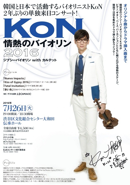 시부야 전승홀에서 '정열의 바이올리니스트'라는 부제로 열리는 이번 콘서트에서는, KoN의 일본 데뷰앨범 'Nuevo Impacto(누에보 임팩토)'의 곡들과, '콘'이 출연한 일본 드라마 '붉은 실의 여자' 수록곡 등 그동안 일본에서 활발하게 활동해왔던 KoN의 대표곡들을 만나볼 수 있다.