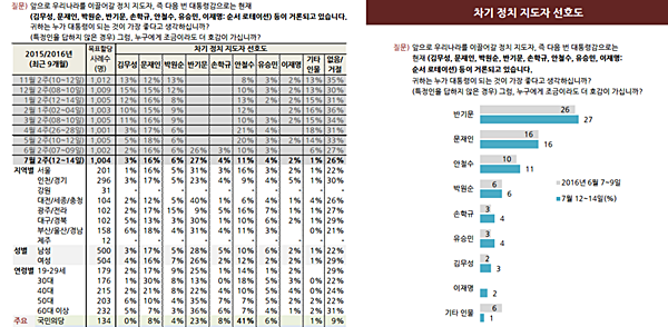 한국갤럽이 발표한 7월 둘째 주(12~14일) 여론조사 결과 차기 대선 주자 선호도에서 반기문 UN 사무총장이 27%의 지지율을 얻어 1위를 달리고 있는 것으로 나타났다. 이어 문재인 더불어민주당 전 대표가 16%, 안철수 국민의당 전 대표가 11%로 각각 2, 3위를 차지했다.