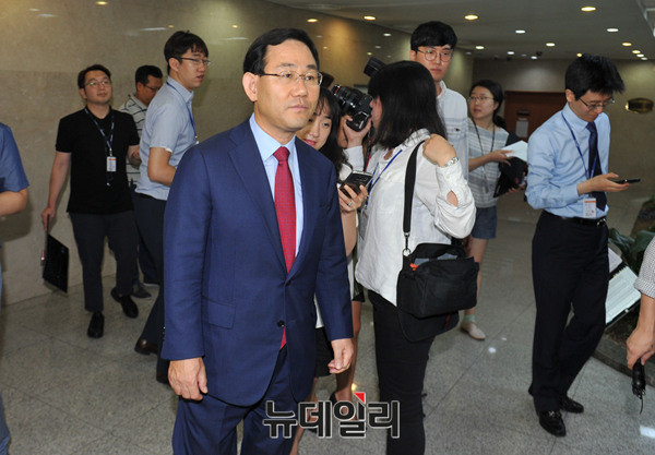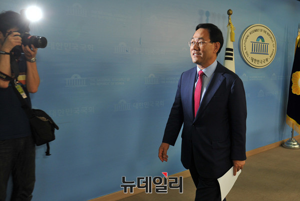 주호영 새누리당 의원이 18일 국회 정론관에서 기자회견을 갖고 8.9 전당대회 당 대표 출마선언 마치고 떠나고 있다.