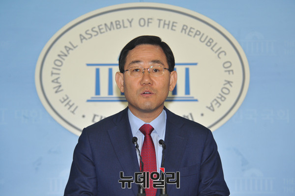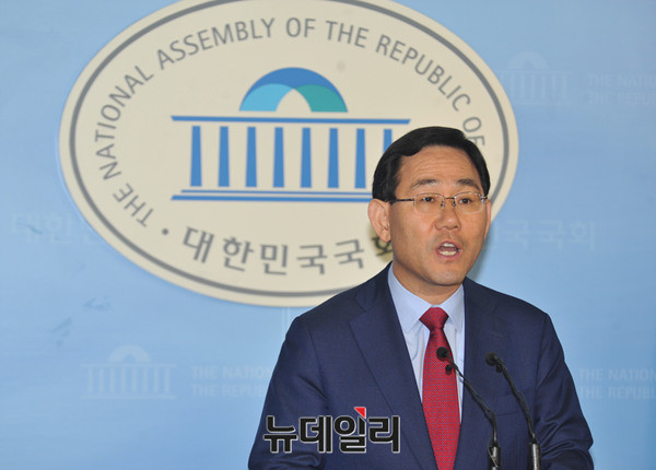 주호영 새누리당 의원이 18일 국회 정론관에서 기자회견을 갖고 8.9 전당대회 당 대표 출마선언을 하고 있다.