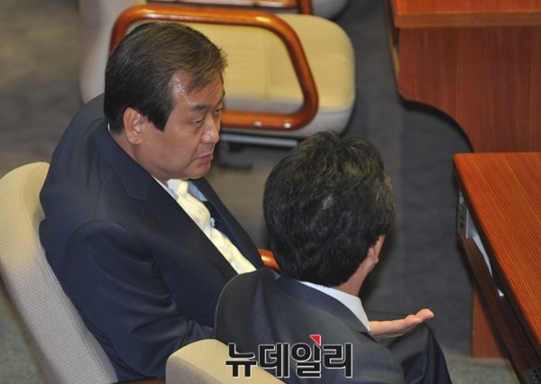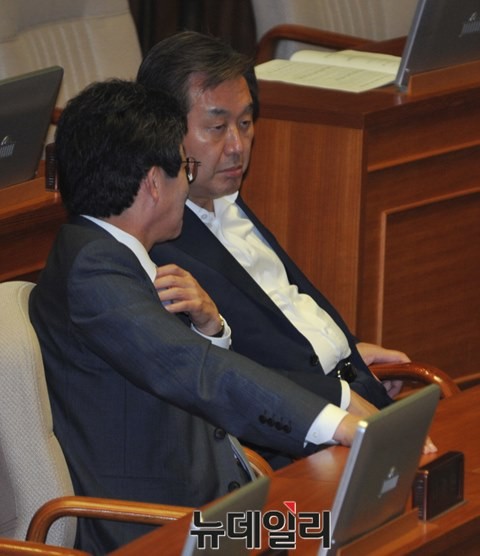 새누리당 김무성 전 대표와 유승민 전 원내대표가 19일 오전 국회에서 열린 본회의 사드(THAAD) 배치에 대한 긴급현안질문에 참석해 대화를 나누고 있다.