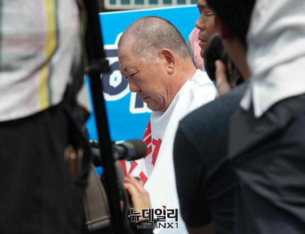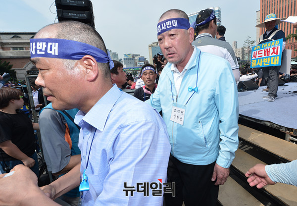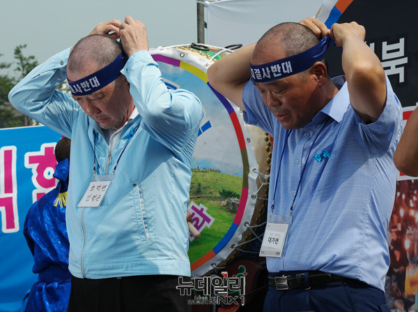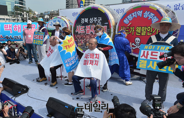 김항곤 성주군수와 배재만 성주군의장이 21일 오후 서울역광장에서 열린 성주군민 고고도미사일방어체계 사드(THAAD) 배치 반대 상경집회에서 참석해 사드배치철회를 주장하며 삭발을 하고 있다.