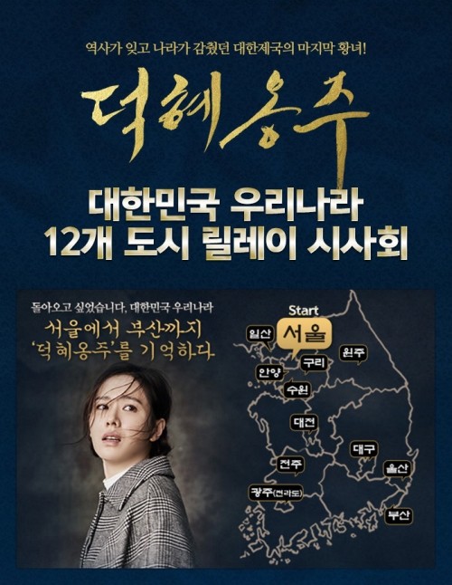 '덕혜옹주'는 오는 27일부터 '대한민국 우리나라 12개 도시 릴레이 시사회'라는 타이틀 하에 서울, 대전, 광주, 대구, 울산, 부산, 일산, 안양, 수원, 구리, 원주, 전주 지역에서 진행될 예정이다.