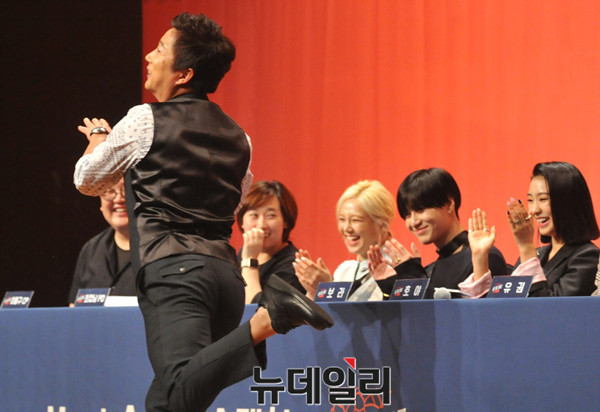 개그맨 이수근이 22일 오후 63스퀘어에서 열린 Mnet '힛 더 스테이지(HIT THE STAGE)' 제작발표회에 참석해 숨겨둔 춤실력을 선 보이고 있다.'힛 더 스테이지'는 스타와 전문 댄서가 한 팀을 이뤄 퍼포먼스 대결을 펼치는 댄스경연 버라이어티 프로그램으로 소녀시대 효연, 샤이니 태민, 씨스타 보라, 인피니트 호야, 블락비 유권, 몬스타엑스 셔누, 트와이스 모모, 엔씨티 텐 등이 출연해 열띤 경연을 펼칠 예정이다. 첫 방송은 오는 27일