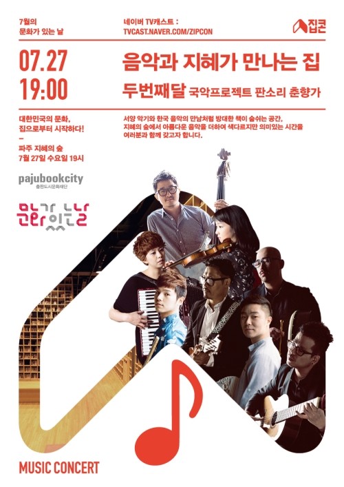 매달 마지막 수요일 '문화가 있는 날'에 열리는 7월 27일 집콘(집들이콘서트)에는 에스닉퓨전밴드 두번째달과 김준수-고영열 두 소리꾼이 함께 한다.