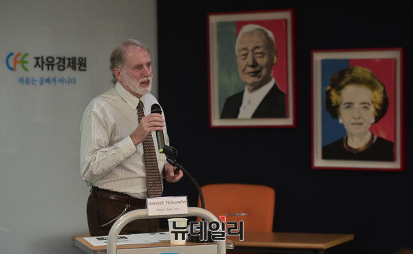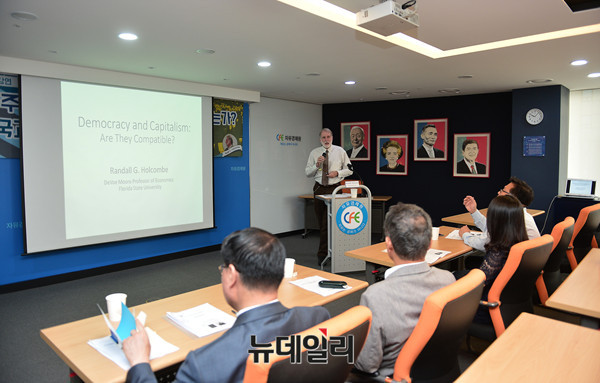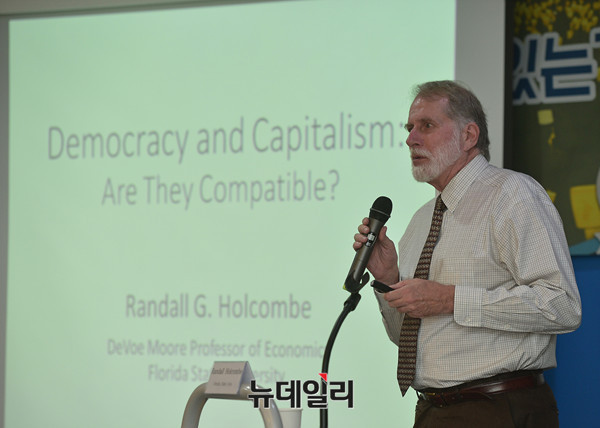 자유경제원이 25일 서울 마포구 자유경제원 리버티홀에서 플로리다 주립대 '랜들 홀콤(Randle G. Holcombe)' 교수를 초청해 '민주주의와 자본주의는 양립할 수 있는가?:미국과 한국 비교'를 주제로 강연회를 개최했다.