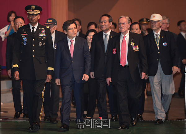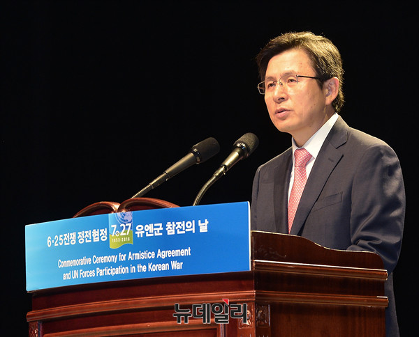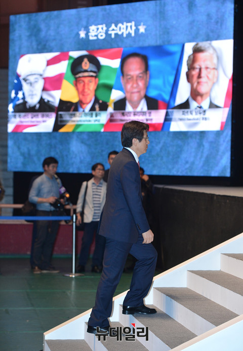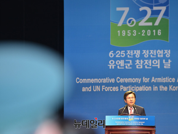 황교안 국무총리가 27일 오전 서울 올림픽공원 올림픽홀에서 열린 '정전협정63주년 및 유엔군참전의날기념식'에 입장하고 있다.